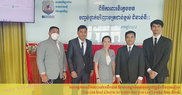 ថ្ងៃព្រហស្បតិ៍ 4កើត ខែបុស្ស ឆ្នាំឆ្លូវ ត្រីស័ក ព.ស. 2565 ត្រូវនឹងថ្ងៃទី6 ខែមករា ឆ្នាំ2022 បេក្ខជនបរិញ្ញាបត្រជាន់ខ្ពស់ ជំនាន់ទី11 ការពារនិក្ខេបបទបញ្ចប់ការសិក្សា នៅសាកលវិទ្យាល័យអាយអាយស៊ី នៃបច្ចេកវិទ្យា។ សូមជូនពរសំណាងល្អដល់និស្សិតគ្រប់រូប!!!