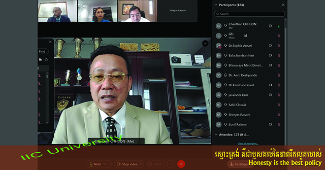 ឯកឧត្តមបណ្ឌិត ឈួន ចាន់ថន សាកលវិទ្យាធិការ នៃសាកលវិទ្យាល័យអាយអាយស៊ីនៃបច្ចេកវិទ្យា បានថ្លែងសុន្ទរកថាស្វាគមន៍ ក្នុងពិធីបើកសន្និសីទអន្តរជាតិអនឡាញ ស្តីអំពី “Innovation and Modernisation in Commerce, Science, Technology, Business Management, Leadership and Entrepreneurship.” រៀបចំដោយ Raisoni Group of Institutions (India) ដែលប្រព្រឹត្តទៅនាថ្ងៃទី4 ដល់ 5 ខែកុម្ភៈ ឆ្នាំ2022 ៕